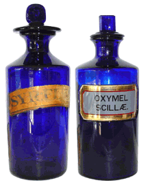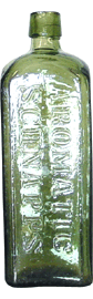 Dalby's Carminative, a very early flatulence remedy. These bottles are ultra-rare. On the left a pontilled version. The right hand bottle dug in South Africa is embossed (Prepared by James Dalby) on rear. |