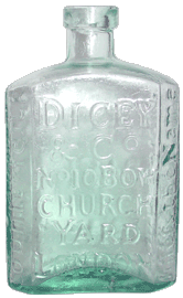 Daffy's. Another (later) version slightly larger than the one pictured on the left. Both bear the wording: "True Daffy's Elixir / Dicey & Co No 10 Bow Church Yard London / Unlefs the Name of DICEY & Co is in the Stamp / Over the Cork the Medicine is Counterfeit". |