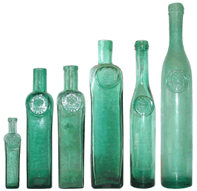 Zara Maraschino Liqueur bottles bearing the seal of F. Drioli, Zara, Dalmatia (now Yugoslavia) with a double headed eagle crest. These scarce liqueur bottles are surely amongst the prettiest and most sought-after. From left to right a miniature true to detail in every aspect, a straight extremely dark aqua with extra large seal, an unusual lipped specimen, a very large straight sided specimen with crisp seal and a medium and large sized conical shape with applied lip (Post 1860).