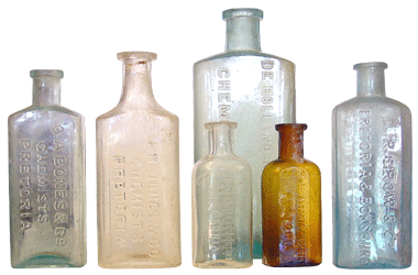 Our first and only Cape Town bottle (Pretoria IS after all more than 1200 Km away) ans not strictly a Chemist but something exceptional! A. NUTTAL / HAIR DRESSER / ADDERLEY St / CAPE TOWN. Dug in an 1894 dump, this must be the earliest South African embossed bottle in my collection.