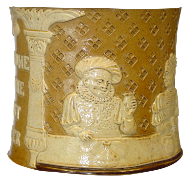 This sprig from a Doulton beer jug is unique in that it clearly shows a period bottle and leather drinking beaker.